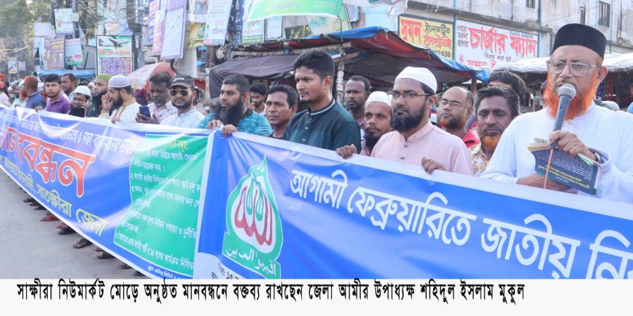 ৫ দফা দাবিতে সাতক্ষীরা খুলনারোড মোড় থেকে ইটাগাছা হাটের মোড় পর্যন্ত ২ কিলোমিটার সড়কজুড়ে জামায়াতের মানববন্ধন