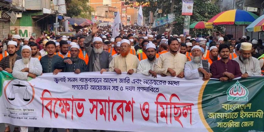 জুলাই জাতীয় সনদের ভিত্তিতে আগামী ফেব্রুয়ারি নির্বাচন এবং জাতীয় নির্বাচনের আগে গণভোটসহ ৫ দফা দাবিতে বিক্ষোভ মিছিল ও সমাবেশ করেছে সাতক্ষীরা জেলা জামায়াতে ইসলামী। শুক্রবার (১৪ নভেম্বর) বিকাল সাড়ে ৪টায় সাতক্ষীরা শহীদ আব্দুর রাজ্জাক পার্ক থেকে বিক্ষোভ মিছিল শুরু হয়। পরে মিছিলটি নিউমার্কেট মোড়, খুলনারোড মোড়, নারকেলতলা মোড়সহ শহরের প্রধান প্রধান সড়ক প্রদক্ষিণ করে একই স্থানে গিয়ে শেষ করে। মিছিলটির নেতৃর্ত্ব দেন জামায়াতের কেন্দ্রীয় সাংগঠনিক সেক্রেটারি ও সাতক্ষীরা সদর আসনে জামায়াত মনোনিত এমপি প্রার্থী মুহাদ্দিস আব্দুল খালেক।